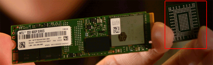 در تصاویر متن، می توانید تفاوت آن با یک برد از سالید درایو های اینتل 600P را مشاهده نمائید. این تراشه به این علت از گونه BGA است که درون خود کنترلر فرمان های لازم را جای داده و از شلوغ کاری های یک PCB مجزا بی نیاز است. در نتیجه می توان تمامی امکانات یک با ظرفیت 1 ترابایت را درون یک تراشه جاسازی کرد.