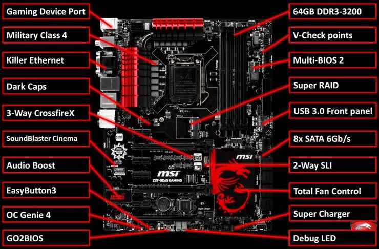 DrMOS: ماسفت های یک مدار تغذیه، داغ ترین المان آن محسوب می شود. در طراحی رایج، معمولا از ماسفت های Low-Side، High-Side و Mosfet Driver در بسته های جداگانه استفاده می کنند. این طراحی علاوه بر افزایش هزینه، افزایش مصرف انرژی و افزایش دمای کاری را به همراه دارد و طراحی مناسبی برای کاربری های حرفه ای طلقی نمی گردد. طراحی ماسفت های DrMOS کمپانی MSI به این صورت است که از یک پکیج کامل، حاوی هر 3 ماسفت استفاده گردد که این طراحی علاوه بر کاهش دمای کاری و کاهش مصرف انرژی، فضای بیشتری را در اختیار ماسفت در حالت بیکاری برای ذخیره جریان الکتریکی قرار می دهد. این موضوع در حالت بیکاری تنها بر عهده ماسفت Low-Side است و با این طراحی مجتمع، با توجه به افزایش دوبرابری سطح مقطع، کاهش دمای کاری را شاهد هستیم. ماسفت های DrMOS تا دمای 115 درجه سانتی گراد به راحتی به فعالیت خود ادامه می دهند.
