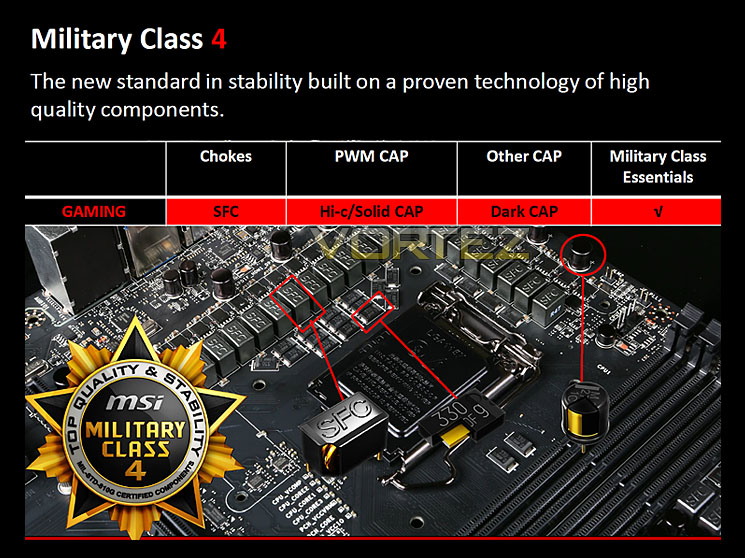 تمام قطعات بکار رفته در VRM مادربوردها و کارت های گرافیک MSI که از استاندارد کلاس نظامی پشتیبانی می کنند به شرح زیر است: