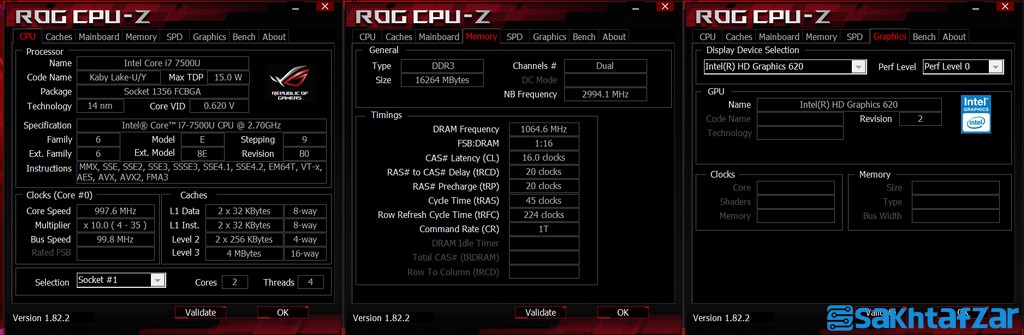در قسمت حافظه موقت، این لپتاپ سبک وزن مجهز به دو کیت 8 گیگابایتی از نوع LPDDR3 (مجموع 16 گیگابایت SDRAM دو کاناله) در فرکانس 2133MHz با تایمینگ CL16 می باشد. در بنچمارک AIDA64 میزان پهنای باند در دسترس و زمان تاخیر رم نمایان است.