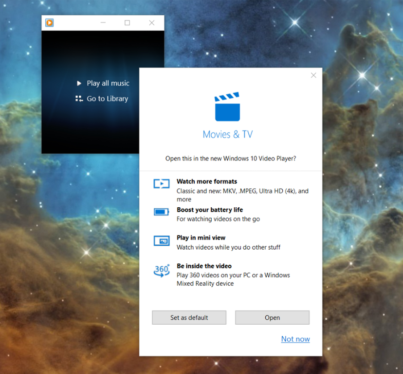 بر اساس گزارشات منتشر شده، پس از اجرای ویندوز مدیا پلیر، پیغامی مبنی بر اجرای برنامه Movies & TV باز خواهد شد و مایکروسافت پیشنهاد می دهد تا فایل خود را با این برنامه اجرا نمایید. در این پیغام مواردی از عملکرد بسیار خوب این برنامه ذکر شده است که می توان به پشتیبانی از فرمت های MKV، MPEG، Ultra HD و موارد دیگر، افزایش عمر باتری، قابلیت نمایش مینی و پشتیبانی از ویدیو های 360 درجه با واقعیت مجازی اشاره کرد.